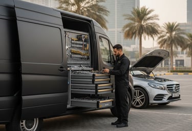 نقدم صيانة سيارات متنقلة في دبي والشارقة وعجمان وأبوظبي ميكانيكي متنقل، كهربائي متنقل، تبديل بطاريات وإطارات، فتح سيارات وورشة متنقلة. تواصل معنا الآن.